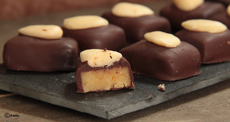 - نغمس كريات اللوز في الشكلاطة ونصففها بطبق