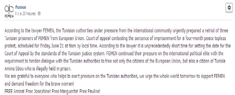 وللإشارة فقد أوردت الصفحة الرسمية لمنظمة فيمن العالمية على الفايسبوك خبرا على لسان أحد محامي الناشطات الثلاث والذي أكد إمكانية الإفراج عليهن نظرا لحجم الضغط الدولي الذي مورس ويمارس على الدولة التونسية من قبل الاتحاد الأوروبي والدول الغربية.