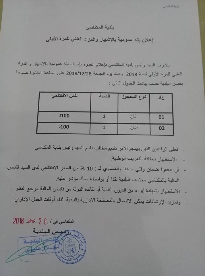 أعلنت بلدية المكناسي من ولاية سيدي بوزيد، على صفحتها الرسمية على موقع التواصل الاجتماعي ''فيسبوك''، عن إجراء بتة عمومية اليوم الجمعة.