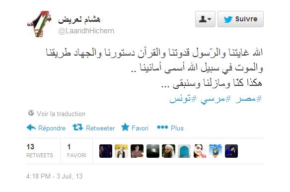 دعا أمس الأربعاء 4 جويلية 2013 نجل رئيس الحكومة المؤقتة علي العريض والمدعو هشام العريض، والذي هو أيضا أحد قياديي حركة النهضة باعتباره أحد أعضاء مجلس شورى الحرك’، إلى الجهاد في مصر معبرا عن استعداده للقتال هناك بعد عزل محمد مرسي، وذلك عبر تغريدة له على موقع التواصل الاجتماعي "تويتر".