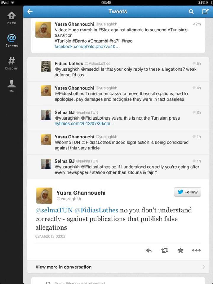 أكدت يسرى الغنوشي ابنة رئيس حركة النهضة الشيخ راشد الغنوشي عبر تغريدة نشرتها على موقع التواصل الاجتماعي "تويتر" أنها ستقوم بقاضاة صحيفة "ذي نيويورك تايمز" الأمريكية بسبب مقال راي نشرته الصحيفة يوم الاثنين الماضي 29 جويلية 2013.
