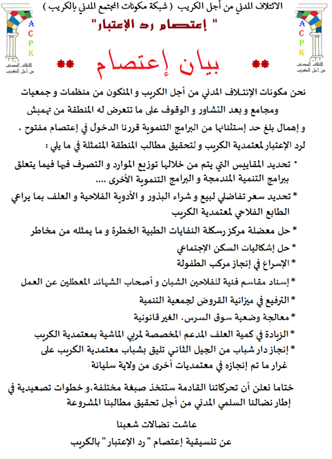 و قد اختار المعتصمون شعار " رد الإعتبار " نظرا لما لحق المنطقة من تهميش و " حقرة " على حد تعبيرهم مطالبون بحل إشكالات السكن الإجتماعي