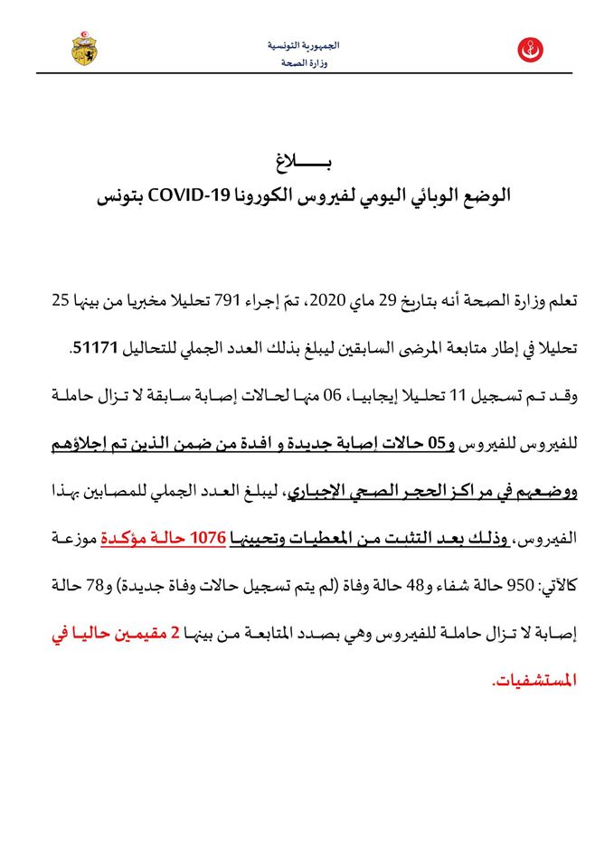 وقد تم تسجيل 11 تحليلا إيجابيا، 06 منها لحالات إصابة سابقة لا تزال حاملة للفيروس للفيروس و05 حالات إصابة جديدة وافدة من ضمن الذين تم إجلاؤهم ووضعهم في مراكز الحجر الصحي الإجباري، ليبلغ العدد الجملي للمصابين بهذا الفيروس، وذلك بعد التثبت من المعطيات وتحيينها 1076 حالة مؤكدة موزعة كالآتي: 950 حالة شفاء و48 حالة وفاة (لم يتم تسجيل حالات وفاة جديدة) و78 حالة إصابة لا تزال حاملة للفيروس وهي بصدد المتابعة من بينها 2 مقيمين حاليا في المستشفيات.