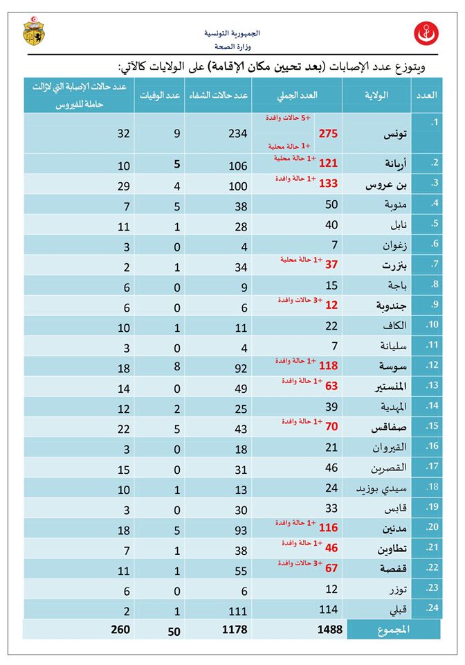 أعلنت وزارة الصحة أنه بتاريخ 28 جويلية 2020، تمّ إجراء 1454 تحليلا مخبريا من بينها 39 تحليلا في إطار متابعة المرضى السابقين ليبلغ بذلك العدد الجملي للتحاليل 92710.