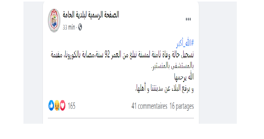 أعلنت الصفحة الرسمية لبلدية الحامة اليوم الخميس في تدوينة لها، أنه تم تسجيل حالة وفاة ثامنة لمسنة تبلغ من العمر 92 سنة، مصابة بالكورونا، مقيمة بالمستشفى بالمنستير.