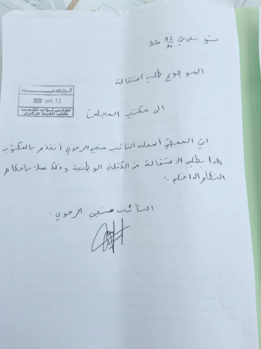 أودع النائب عن الكتلة الوطنية المنجي الرحوي إستقالته من الكتلة الوطنية اليوم الإثنين بمكتب الضبط لدى مجلس نواب الشعب.