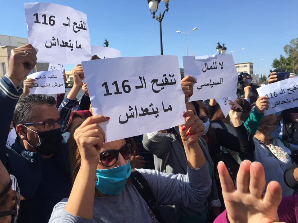 نفذ عدد كبير من الصحفيين أمام مقر مجلس نواب الشعب اليوم الثلاثاء إحتجاجا منهم على مبادرة تنقيح المرسوم 116 التي قدمتها كتلة إئتلاف الكرامة.