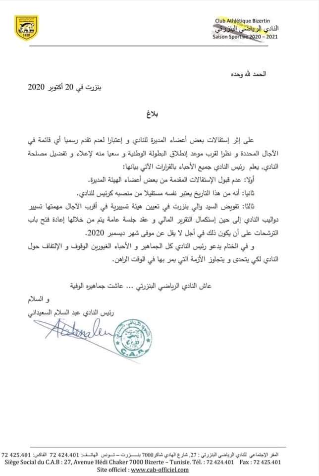 إستقال عبد السلام السعيداني اليوم الثلاثاء رسميا من رئاسة النادي البنزرتي وجاءت الاستقالة في بلاغ نشره السعيداني على صفحته بموقع التواصل الاجتماعي طالب فيه والي الجهة بتعيين هيئة تسييرية.