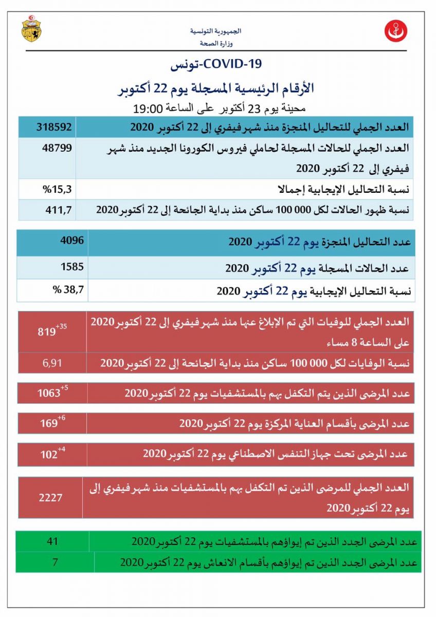 أعلنت وزارة الصحة في بلاغها المحيّن اليوم السبت 24 أكتوبر 2020، تسجيل 1585 إصابة جديدة بفيروس كورونا يوم 22 أكتوبر، و35 وفاة جديدة ما يرفع العدد الجملي للوفيات إلى 819 حالة.