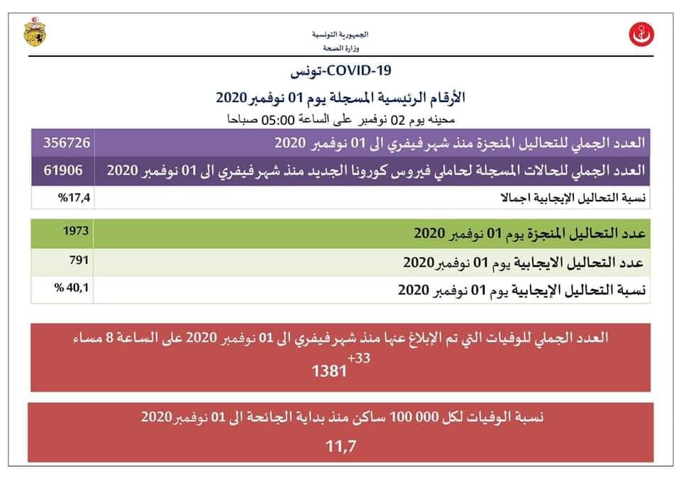 أعلنت وزارة الصحة اليوم الاثنين 2 نوفمبر 2020 أنه تم تسجيل 791 إصابة جديدة بفيروس كورونا يوم أمس بعد إجراء 1973 تحليلا.
