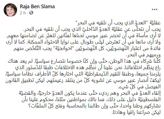 وأضافت رجاء بن سلامة في تدوينة على صفحتها بموقع التواصل الاجتماعي فتايسبوك "لا أرى مأساة في أن تحضر عبير موسي تجمّعا لفنّانين لتعبّر عن تضامنها معهم. ولا أرى مانعا في أن تعترض ليلى طوبال على نوايا الاحتواء الممكنة. كما لا أرى فائدة من اعتبار النّهضويّين، كل النّهضويّين “اخوانجيّة” يجب التّلخّص منهم ورميهم في البحر.