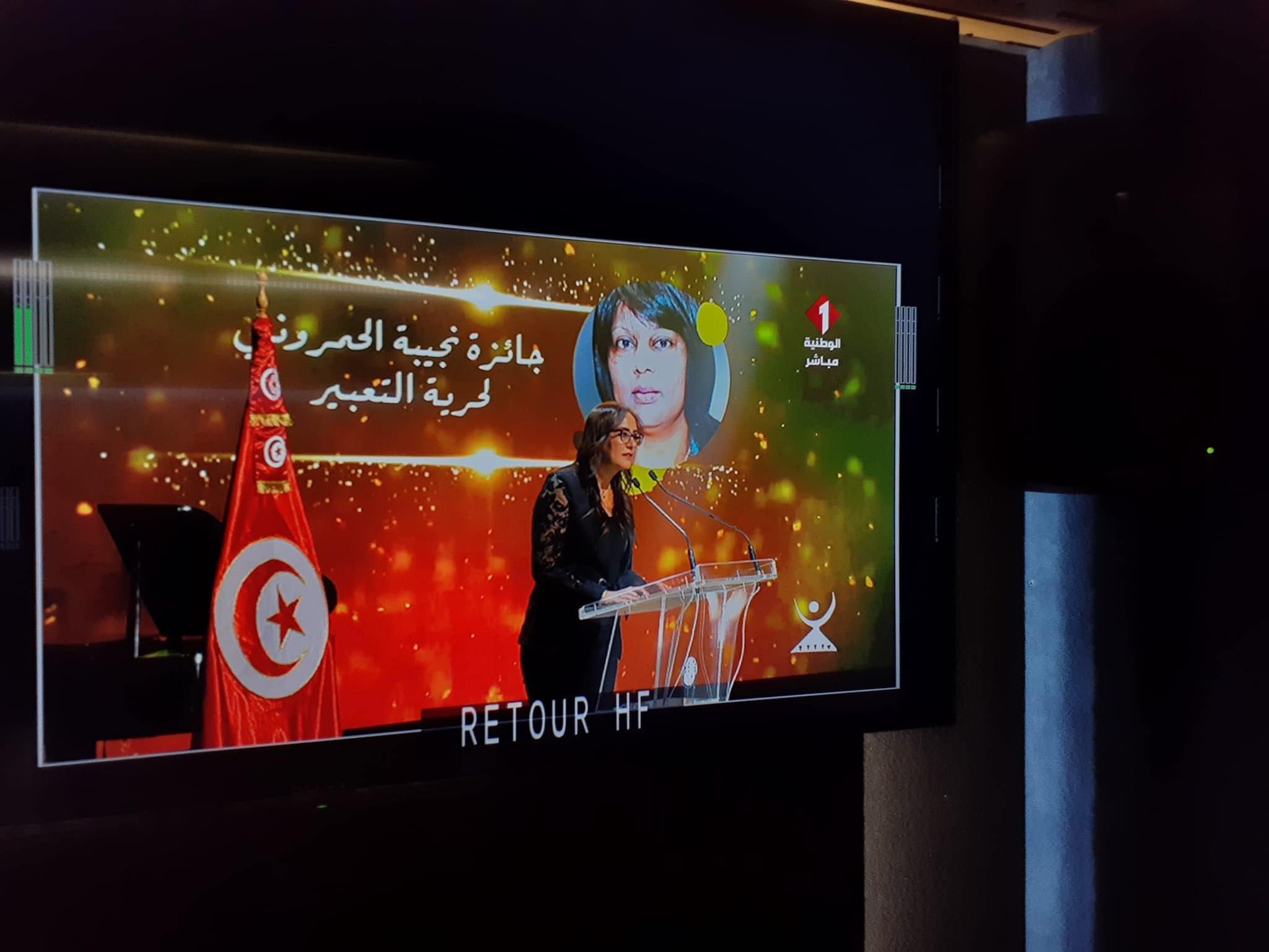 وكانت لجنة تحكيم مسابقة جائزة النقابة الوطنية للصحفيين التونسيين "نجيبة الحمروني لحرية التعبير" في هذه الدورة الثانية والعشرين لأيام قرطاج المسرحية قد حرصت على مشاهدة كل العروض التونسية التي تتناول مسألة الحريات بصفة عامة وحرية التعبير على وجه الخصوص نظرا لارتباطها باسم فقيدة الساحة الإعلامية النقيبة الراحلة نجيبة الحمروني التي تميزت طوال مسيرتها بالدفاع عن قواعد وأخلاقيات المهنة من جهة، وعلى الحريات وخاصة حرية الصحافة وحرية التعبير من جهة أخرى وقد دفعت للأسف ثمن ذلك باهضا من قبل أعداء الحرية.