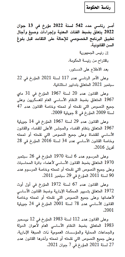 صدر في العدد الأخير للرائد الرسمي للجمهورية التنسية بتاريخ اليوم الثلاثاء 14 جوان 2022، أمر رئاسي يتعلق بضبط الفئات المعنية وإجراءات وضيغ وآجال تطبيق البرنامج الخصوصي للإحالة على التقاعد قبل بلوغ السن القانونية (57 سنة).