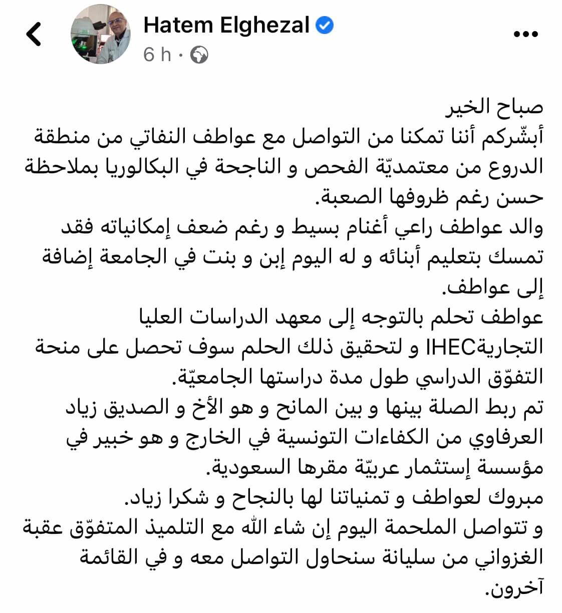 و أعلن عبر حسابه الرسمي بموقع التواصل الاجتماعي فايسبوك، أنه سيتكفل بمصاريف كل من التلميذ بسام العرفاوي من ولاية عين دراهم و التلميذة عواطف النفاتي من منطقة الفحص.