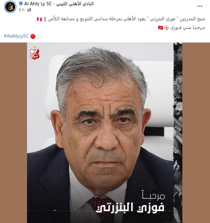 أعلن النادي الأهلي الليبي أن المدرب التونسي فوزي البنزرتي سيقود الفريق في مرحلة سداسي التتويج ومسابقة الكأس.