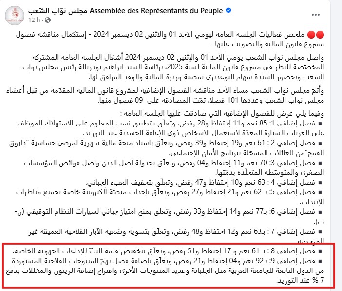 وقد صادق البرلمان على هذا الفصل بـ92 صوتًا بـ"نعم" مقابل احتفاظ 4 نواب بأصواتهم ورفض 21 آخرين، علمًا وأنه تمت، مساء الاثنين 2 ديسمبر 2024، المصادقة على مشروع قانون المالية لسنة 2025 برمته.