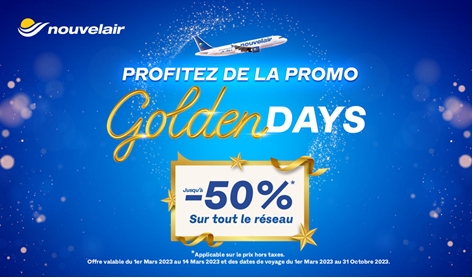 À l'approche de la saison estivale, nouvelair lance sa promo baptisée les ''golden days de nouvelair '' qui offre à ses clients des réductions allant jusqu’à 50%* sur toutes les destinations de son réseau.