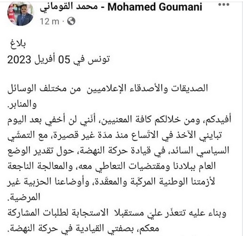 Goumani indique ce mercredi 05 avril, dans un communiqué à la presse, qu' »il ne passera plus sous silence à partir d’aujourd’hui, ses divergences croissantes avec l’orientation politique de la direction du mouvement Ennahdha, sur l’évaluation de la situation générale dans le pays, et les exigences de la considérer, ainsi que sur le règlement efficace de notre crise nationale complexe et compliquée, et notre situation partisane non satisfaisante ».