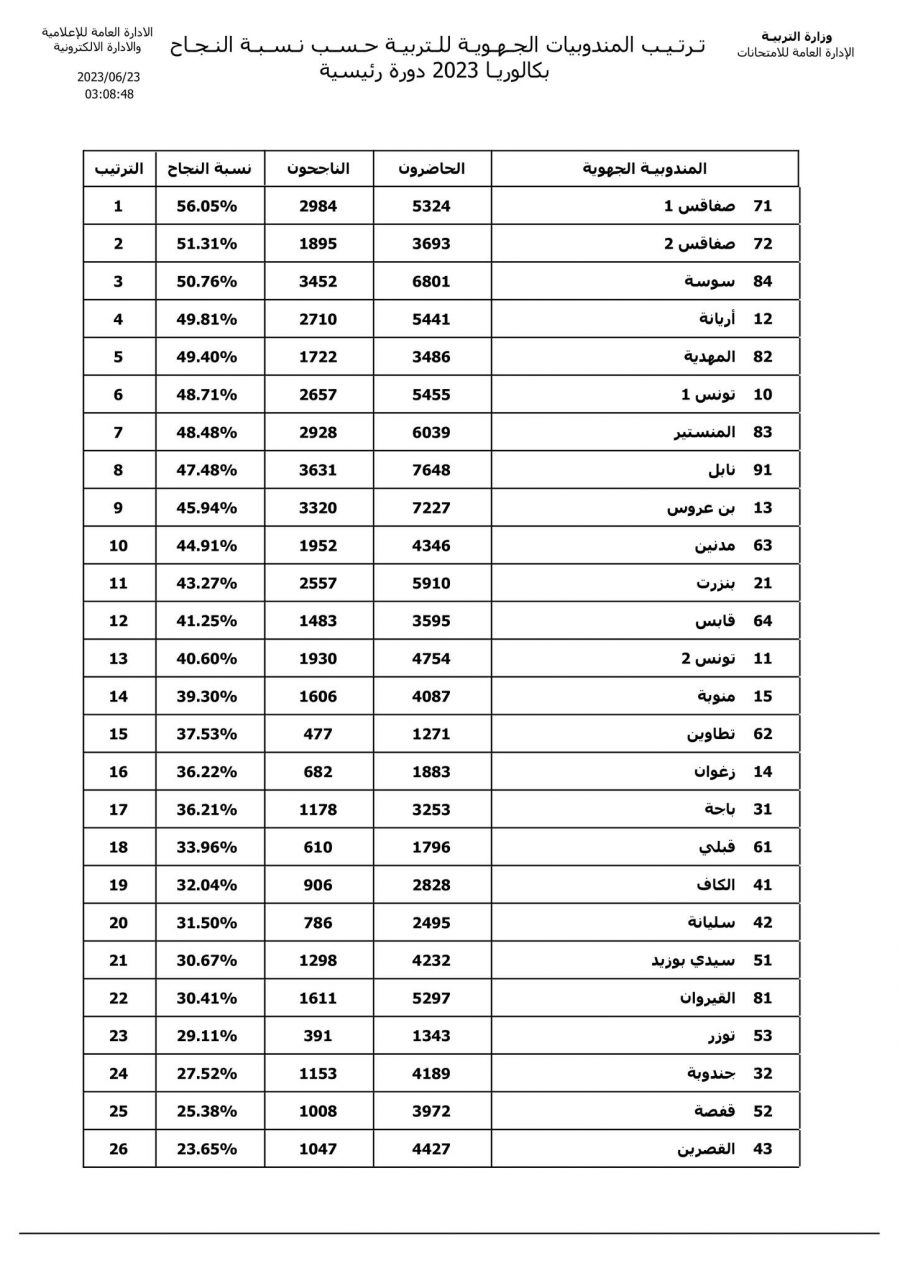 Le taux général de réussite est de 36.38 % ; des candidats ont décroché cette clef aux études universitaires avec mention. Les sept lauréats du baccalauréat 2023, appartiennent à trois lycées pilote, et quatre lycées publics situés dans différentes régions du pays, ce qui nous met du baume au cœur quant à la capacité de l’école publique de produire encore l’excellence et le talent.Ce faisant, le baccalauréat se présente comme un objet de compétition, voire d’émulation entre les différentes régions de Tunisie. Selon le classement des délégations régionales de l’enseignement ; Sfax dans ses deux délégations et Sousse trônent en trio de tête, s’agissant du taux de réussite à la session principale de juin 2023.