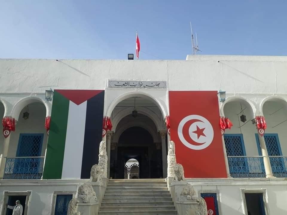 De grands drapeaux tunisiens et palestiniens ont été accrochés à l’Assemblée des Représentants du Peuple 'ARP' à l’ouverture de la plénière de ce mardi 18 mai 2021,