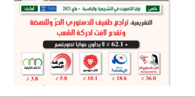 Le Parti destourien libre caracole toujours en tête en termes d’intentions de vote aux législatives avec 36% selon le dernier sondage d’opinion réalisé par Sigma Conseil et publié par le journal Le Maghreb, ce mardi 25 mai 2021.