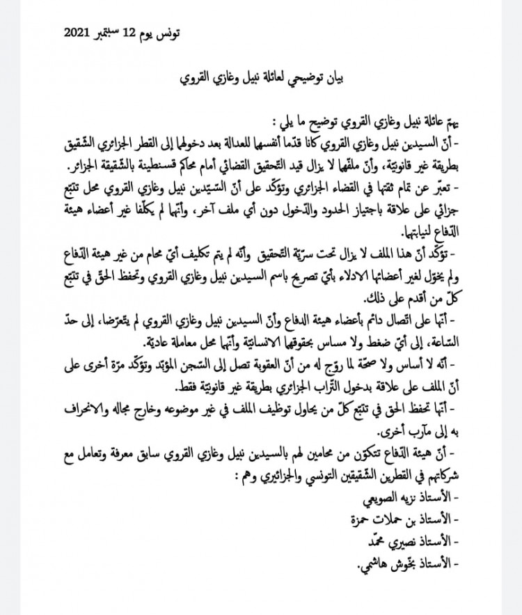 Le communiqué précise que la famille se réserve le droit de traquer toute personne qui tenterait d’instrumentaliser le dossier et de le détourner à d'autres fins, et que comité de défense se compose d’avocats qui ont des connaissances préalables en lien avec leurs entreprises dans les deux pays frères la Tunisie et l’Algérie : Me. Nazih Souii, Me. Ben Hamlet Hamza et Me. Nasiri Mohammed.