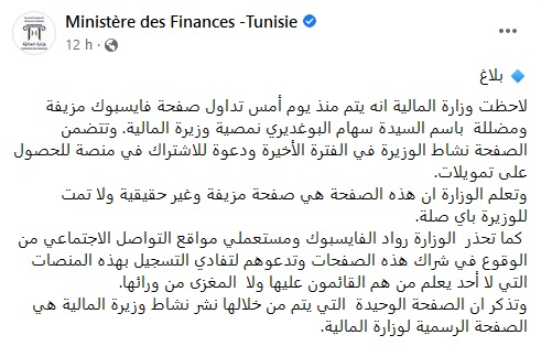 Le ministère des Finances met en garde contre une fausse page, Facebook, au nom de la ministre, Sihem Boughdiri Nemsia.